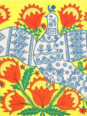 This bouquet is based on the painting “The Dove Spreads its Wings and Asks for Peace” by Ukrainian artist Maria Primachenko