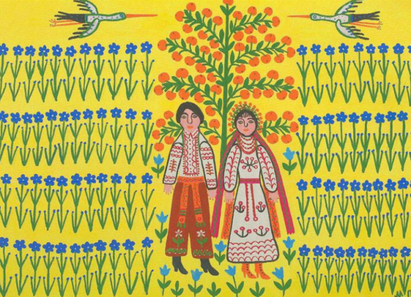 The bouquet is based on the painting by Ukrainian artist Maria Primachenko, “Flax in Bloom, a Bride Goes to Her Bridegroom”.