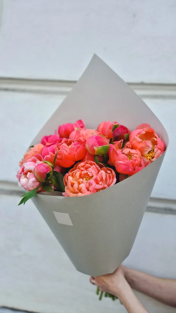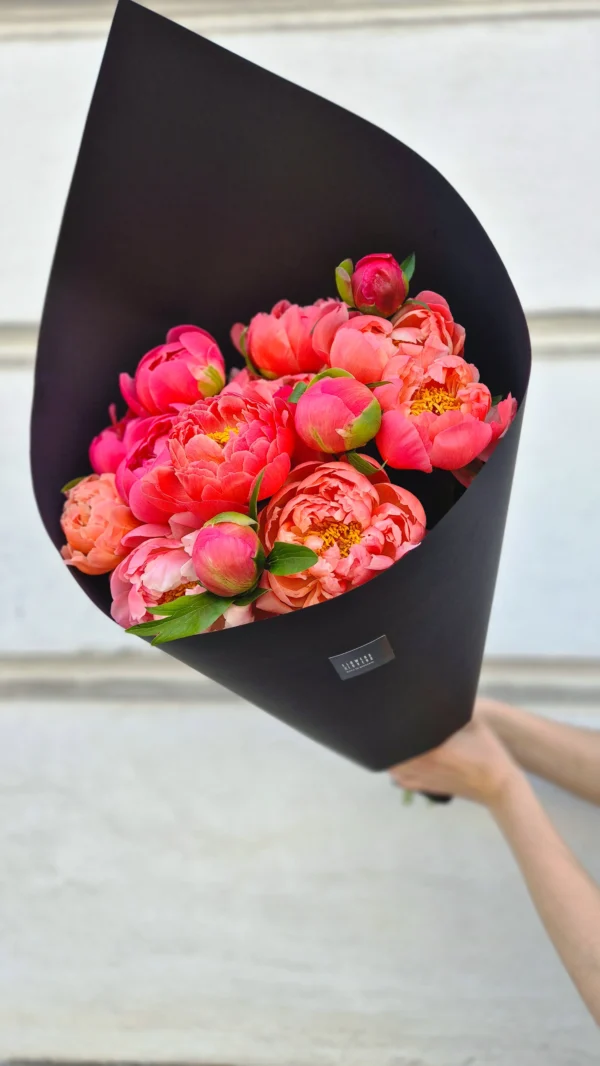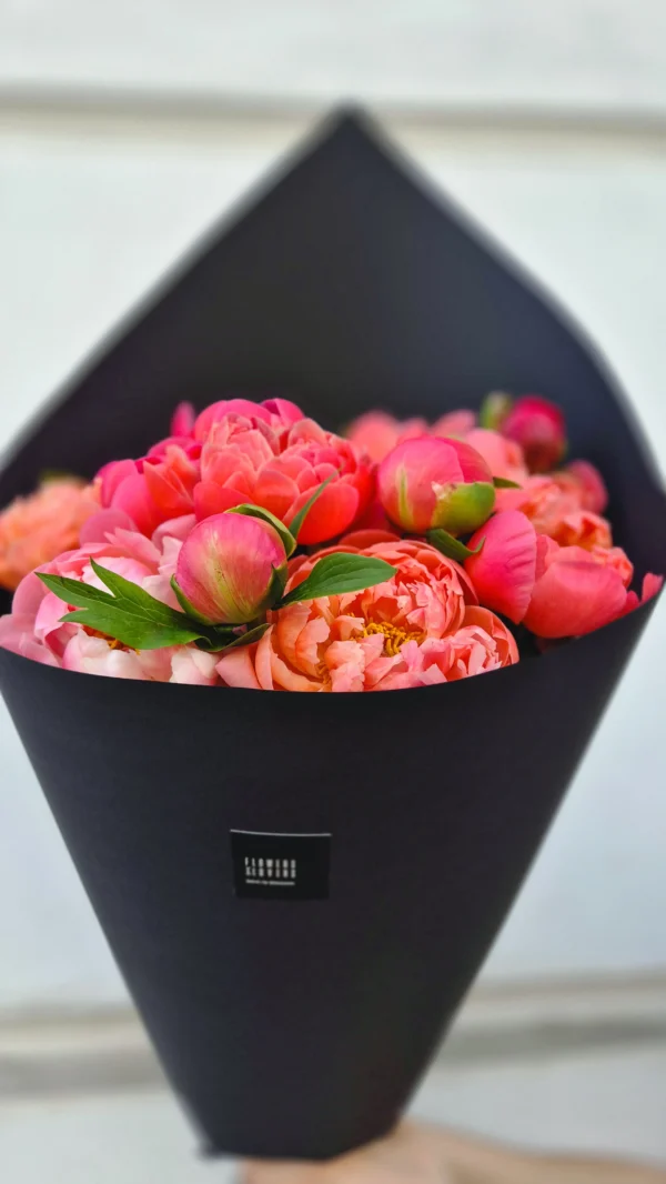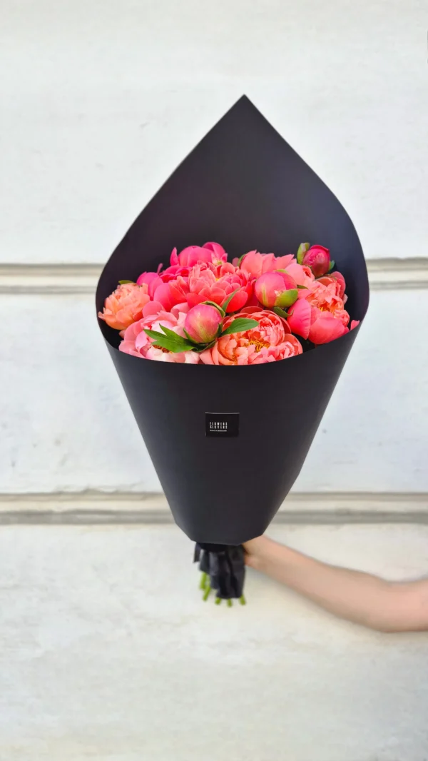 Let this bouquet tell the story of feelings. This exquisite seasonal bouquet consists of bright coral, soft pink and rich pink peonies wrapped in elegant matt paper (optionally black or light).