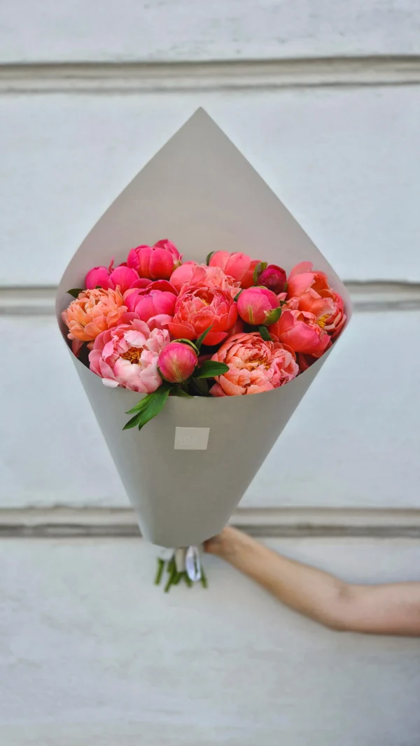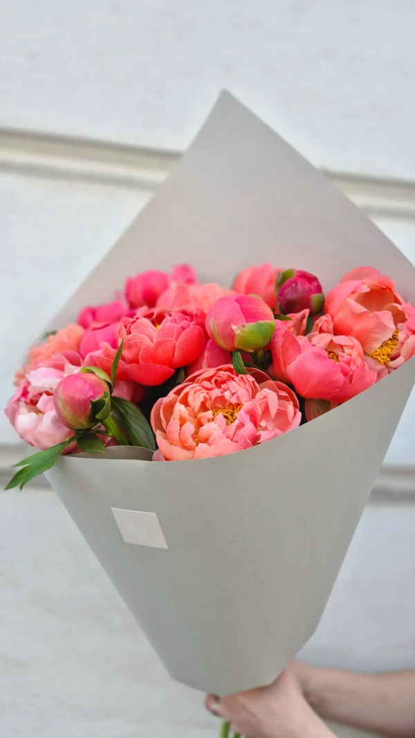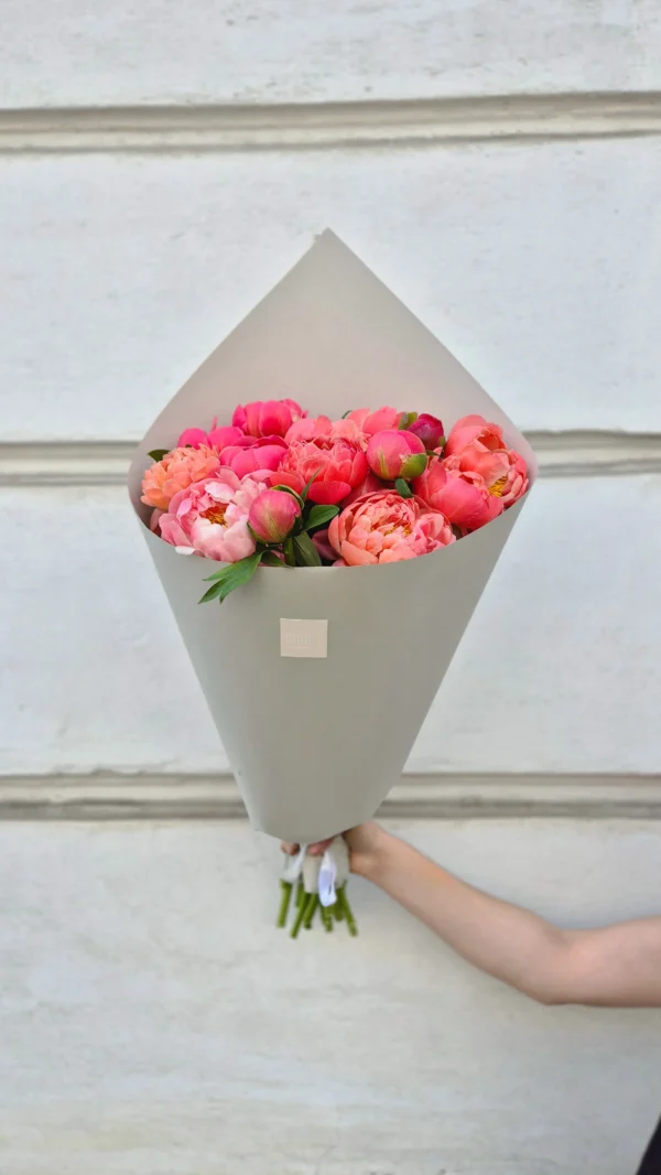 Luxury and tenderness in one – a bouquet of peonies in rich pink and coral shades that captivates with its natural beauty and charm. The photo shows a bouquet with 15 flowers.
